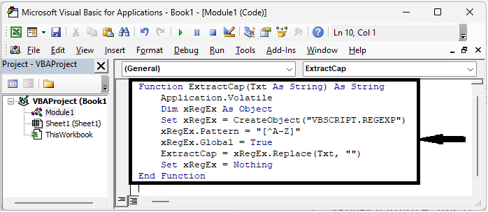 这里,我们将首先使用VBA创建一个用户自定义公式,然后使用该公式来完成任务。让我们来看一个简单的过程,了解如何在Excel中从文本字符串中提取大写字母或以大写字母开头的单词。