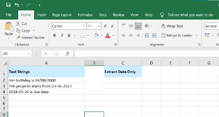 按Enter键后,公式将从文本字符串中提取日期并将其显示在所选单元格中。请参考随附的屏幕截图以查看提取日期的可视化表示。