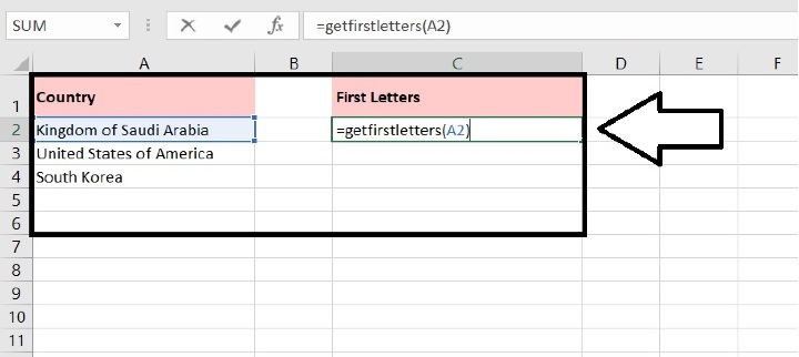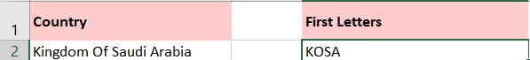 然后保存并关闭此代码,返回工作表,并在空白单元格中输入此公式 **=GetFirstLetters(A2)** (A2 指示您要提取首字母的单元格,您可以根据需要更改它)。请参见屏幕截图 -