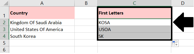 然后按 **Enter** 键,选择单元格B2,然后将填充柄拖动到您要应用此公式的单元格。所有首字母都已从一系列单词中提取,请参见屏幕截图 -