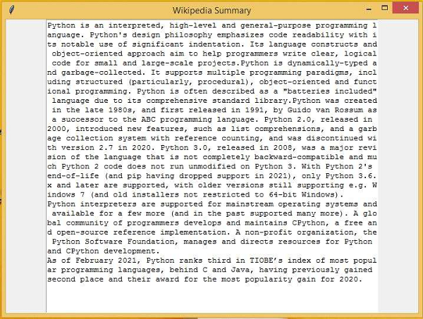 在这个程序中,我们将在维基百科中提取 Python 编程的摘要,并将其打印在文本框内。