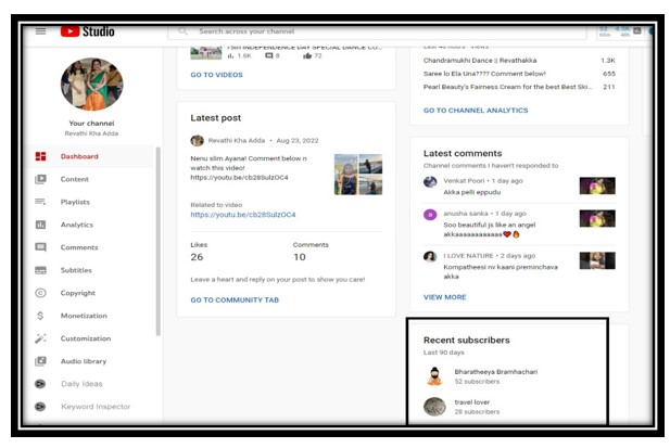 步骤 2 - 你将被带到频道仪表板页面。在右下角,你会找到过去 90 天内最近订阅者的列表。