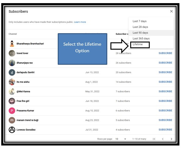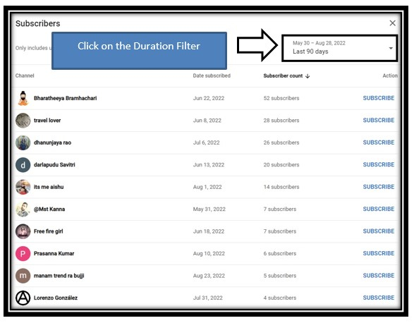 步骤 6 - 你会看到自创建频道以来的订阅者列表,并可从此列表中查看关注你频道的顶级订阅者。点击“时长筛选器”,选择“全部时间”选项。