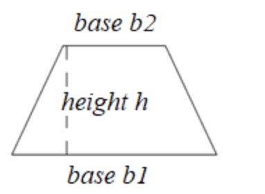 Area of Trapezium - ½ * (b1 + b2) * h b1 - length of one parallel side of a Trapezium b2 - length of another parallel side of a Trapezium h - the distance between the parallel sides of a Trapezium.