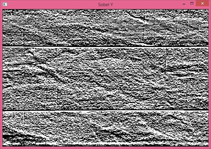 运行上述程序时,它将生成以下两个输出窗口。Sobel X 窗口显示 X 方向(水平)的导数,Sobel Y 窗口显示 Y 方向(垂直)的导数。