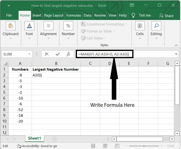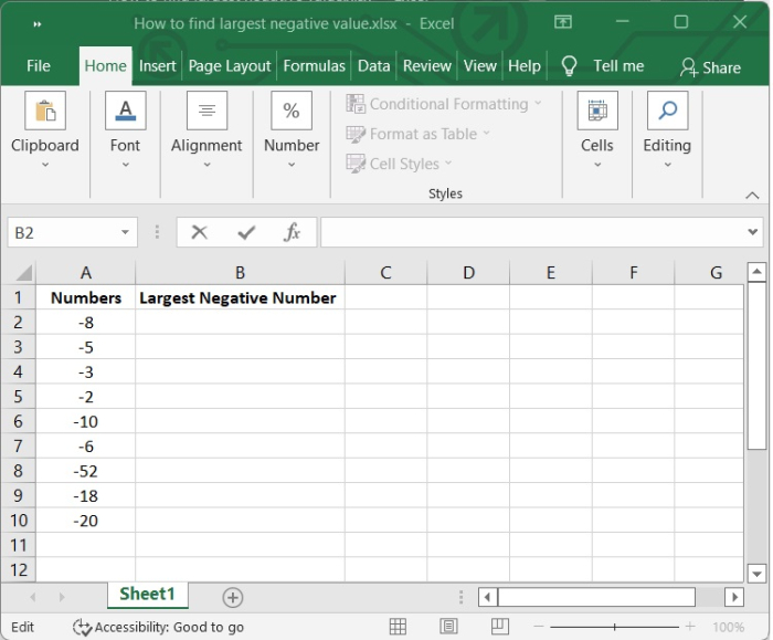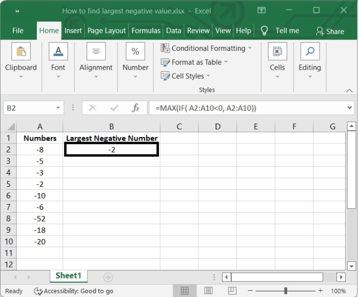 然后,最大的负数将写入 B2 单元格。请参阅下图 -