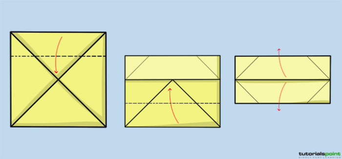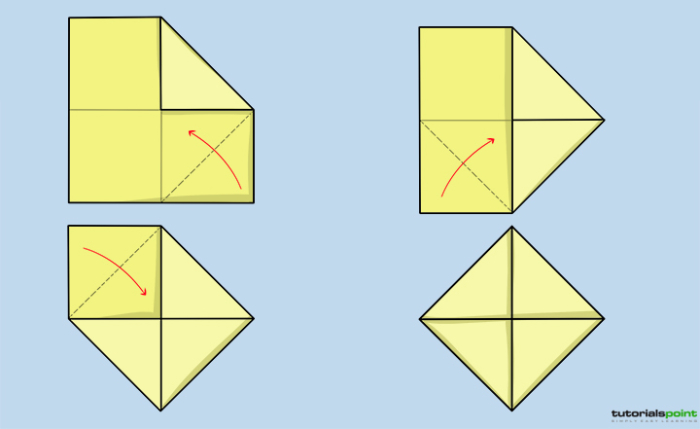 之后,沿着对角线将纸张对折。再次检查边缘是否正确对齐。现在,您应该在纸上有了四个折痕。