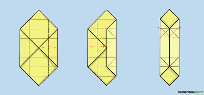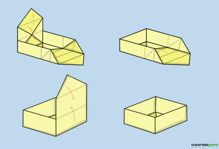 该过程的最后一步是折叠盒子的顶部翻盖,以便可以按预期将其关闭。确保其中一个纸张的翻盖折叠起来,使其与另一个翻盖连接,然后将其放在一边。首先确保边缘彼此固定,然后将边缘向内折叠到中心。以相同的方式处理另一侧。