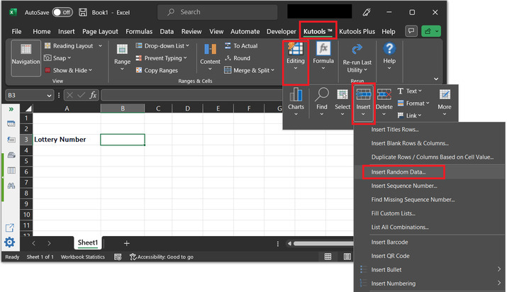 转到“Kutools”选项卡并选择“编辑”。在“编辑”部分下,转到“插入”选项,然后单击下图中突出显示的“插入随机数据”。