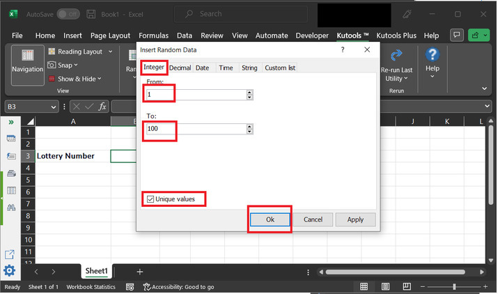 这将打开“插入随机数据”对话框。在生成的框中,将数据范围设置为1到100,以生成彩票号码。之后勾选“唯一值”选项。这将生成一个唯一的随机数。最后,单击“确定”按钮。