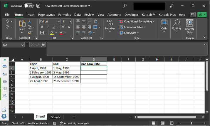 为了理解生成随机数的过程,让我们创建一个包含起始日期和结束日期的示例 Excel 表格。这两个日期用作范围,新生成的随机日期应在这两个日期之间。