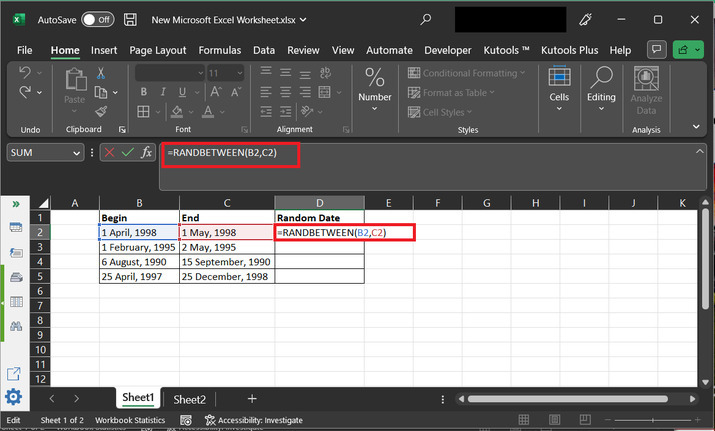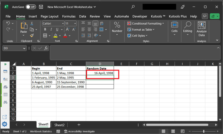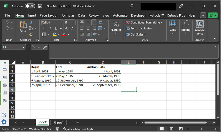 随机数据是一种随机生成的数据类型。本文重点介绍如何生成随机日期。随机数据可以在指定范围内创建,也可以抽象地生成以向用户展示某些数据。本文使用两个示例来演示用户如何轻松地在两个指定日期之间生成随机日期的方法。第一个示例侧重于使用公式和 RANDBETWEEN() 方法,第二个示例侧重于使用 Kutools。