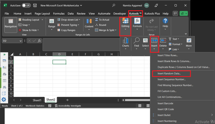 要生成随机日期,请转到 **Kutools** 选项卡并选择“编辑”选项。在“**编辑**”选项中,单击“**插入随机数据**”。