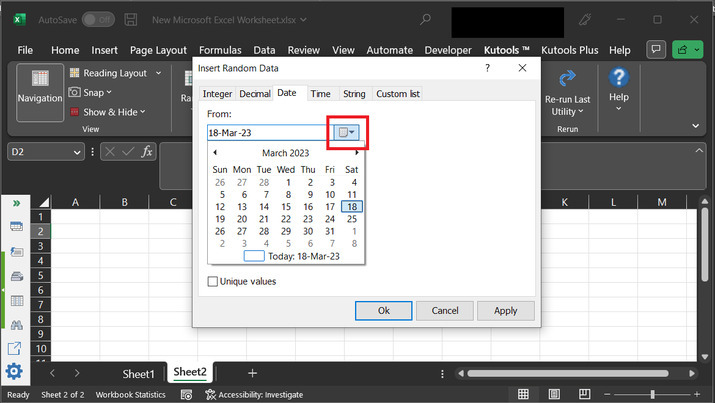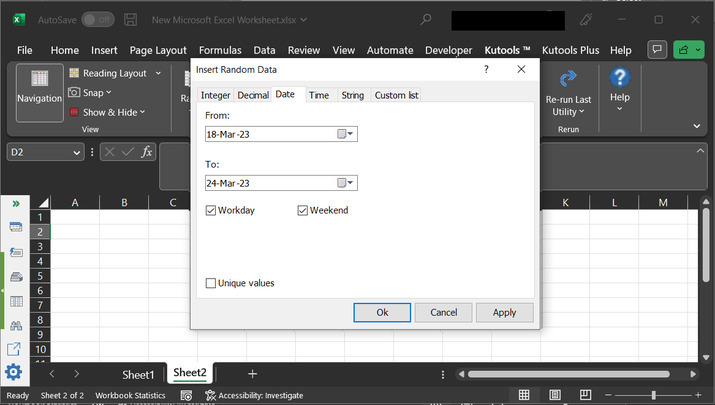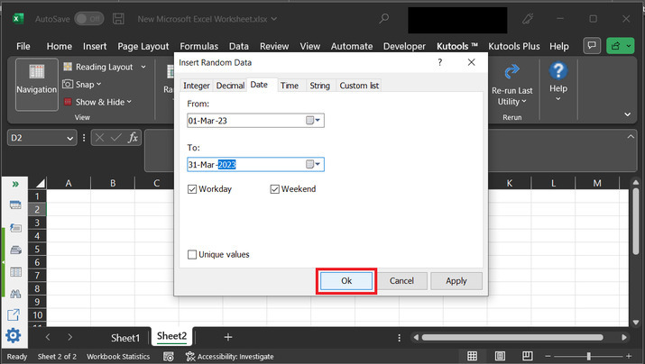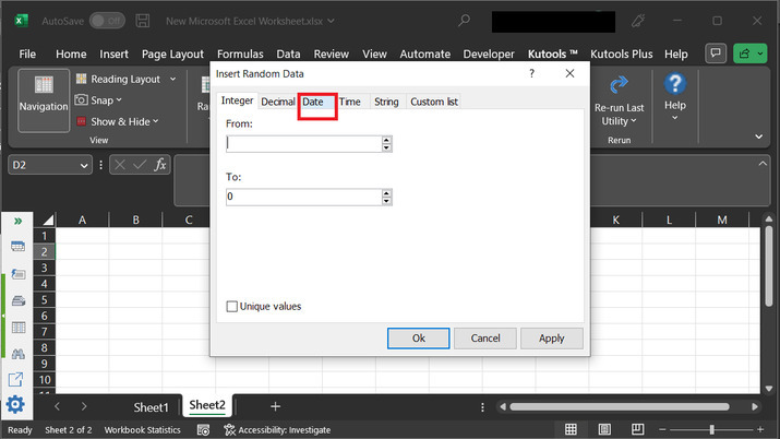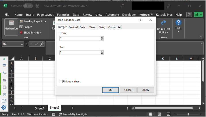 上述步骤将打开“**插入随机数据**”对话框。此对话框允许用户输入两个输入。这些输入基本上是范围。