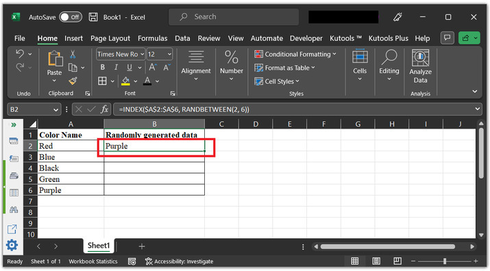 按“Enter”键。这将在 B2 单元格中随机显示一个颜色名称。请参考下图以获得正确的参考