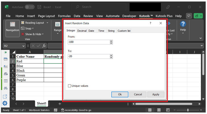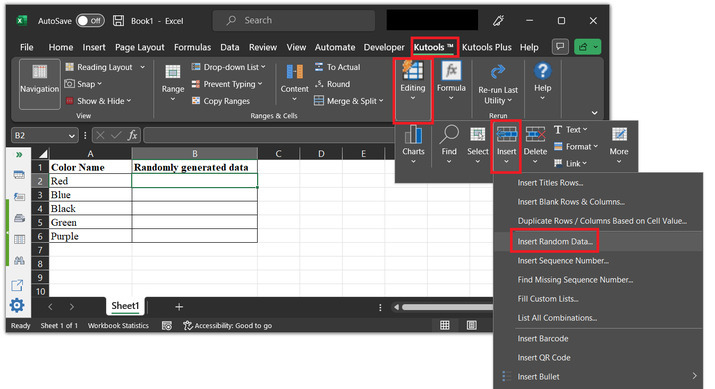 转到菜单功能区,然后单击“Kutools”选项。 然后转到“编辑”部分。选择“插入”选项,并选择“插入随机数据”选项,如下面的图像所示。