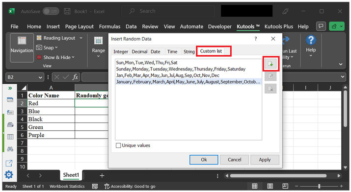 选择最后一个选项卡“自定义列表”。由于提供的数据为字符串数据类型,用户需要将数据集添加到列表值中,以从中生成一个通用的随机值。然后单击下面显示的第一个“加号”选项,以添加数据范围。
