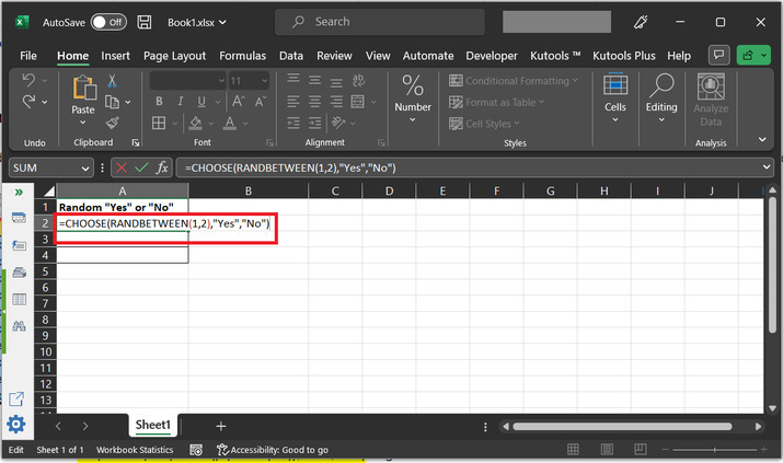 现在,在活动单元格中输入公式。“=CHOOSE(RANDBETWEEN(1,2),"Yes","No")”。