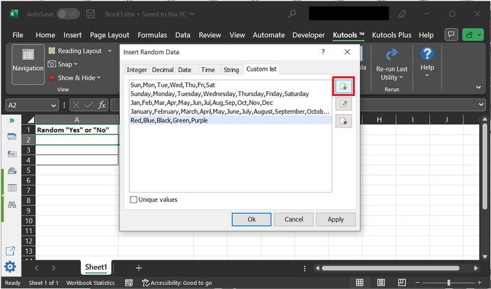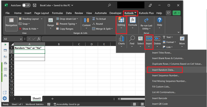 示例2:使用Kutools在Excel中生成随机的“是”或“否”