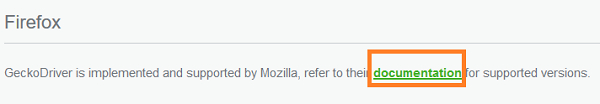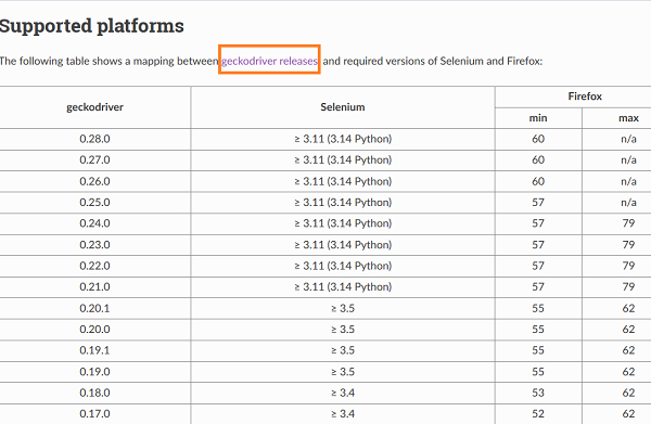 在“受支持的平台”页面中,单击 geckodriver 版本 链接。