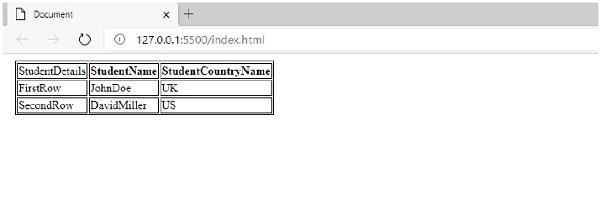<table> <tr id='StudentDetails'> <th>StudentName</th> <th>StudentCountryName</th> </tr> <tr id='FirstRow'> <td>JohnDoe</td> <td>UK</td> </tr> <tr id='SecondRow'> <td>DavidMiller</td> <td>US</td> </tr> </table>