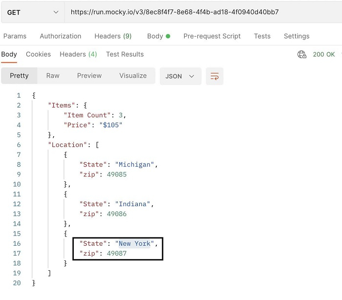 使用 Rest Assured,让我们获取 State 值为纽约的 zip 字段的值。