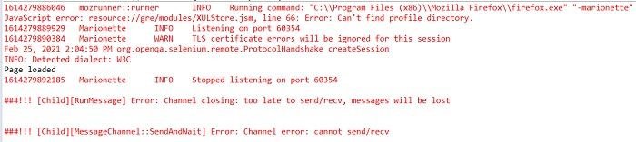 执行测试完成后,将生成日志记录,因为 Firefox 登录使用 geckodriver 登录。Firefox 生成的日志记录可通过设置某些参数禁用。