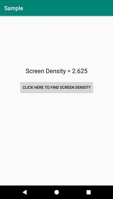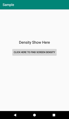 <?xml version="1.0" encoding="utf-8"?> <RelativeLayout xmlns:android="http://schemas.android.com/apk/res/android" xmlns:tools="http://schemas.android.com/tools" android:layout_width="match_parent" android:layout_height="match_parent" tools:context=".MainActivity"> <TextView android:id="@+id/textView" android:layout_width="wrap_content" android:layout_height="wrap_content" android:layout_alignParentTop="true" android:layout_centerHorizontal="true" android:layout_marginTop="180dp" android:text="Density Show Here" android:textAppearance="?android:attr/textAppearanceLarge" /> <Button android:id="@+id/btnShowDensity" android:layout_width="wrap_content" android:layout_height="wrap_content" android:layout_below="@+id/textView" android:layout_centerHorizontal="true" android:layout_marginTop="20dp" android:text="Click here to Find screen density" /> </RelativeLayout>