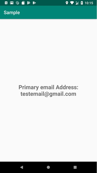 <?xml version="1.0" encoding="utf-8"?> <RelativeLayout xmlns:android="http://schemas.android.com/apk/res/android" xmlns:tools="http://schemas.android.com/tools" android:layout_width="match_parent" android:layout_height="match_parent" android:padding="8dp" tools:context=".MainActivity"> <TextView android:id="@+id/textView" android:layout_centerInParent="true" android:layout_width="wrap_content" android:layout_height="wrap_content" android:textSize="24sp" android:textStyle="bold" android:textAlignment="center" android:text="Primary email Address: testemail@gmail.com" /> </RelativeLayout>
