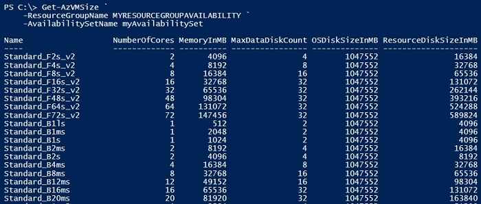 Get-AzVMSize ` -ResourceGroupName MYRESOURCEGROUPAVAILABILITY ` -AvailabilitySetName myAvailabilitySet