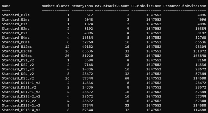 Get-AzVMSize -ResourceGroupName ResourceGroup1 -VMName TestVM