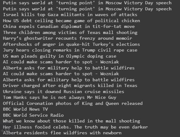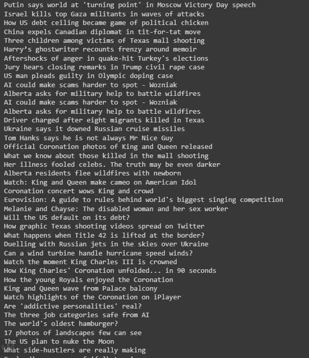 ”标签的数组。最后,使用“text.strip()”方法去除每个元素的outerHTML,只显示其文本内容,脚本迭代地遍历“headlines”数组并依次显示每个项目。