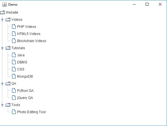 DefaultMutableTreeNode node1 = new DefaultMutableTreeNode("Videos"); DefaultMutableTreeNode node2 = new DefaultMutableTreeNode("Tutorials");