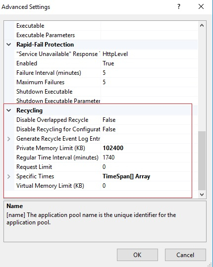 若要通过 GUI 获取 IIS 应用程序池回收设置,您需要检查应用程序池高级设置。