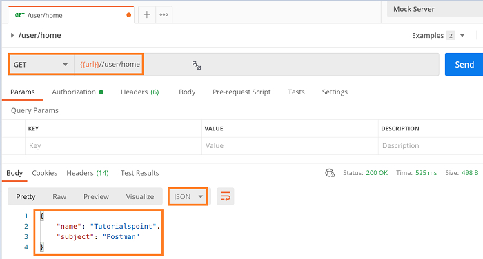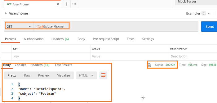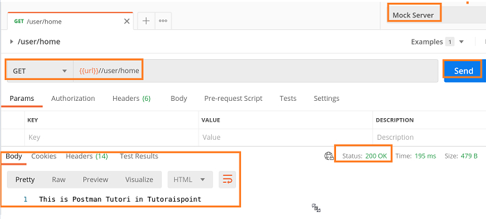 步骤 5 - 选择模拟服务器作为环境并发送请求。响应正文 – This is Postman Tutori in Tutorialspoint 将以HTML格式显示。