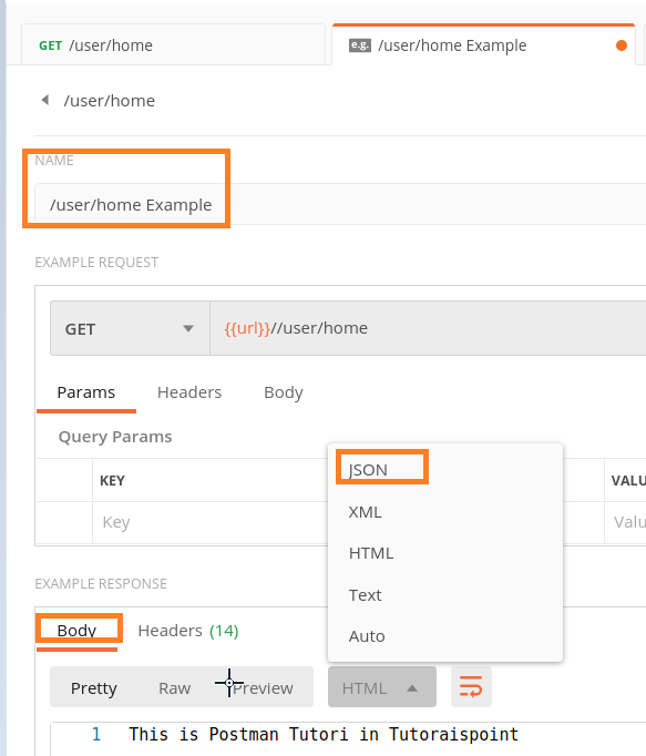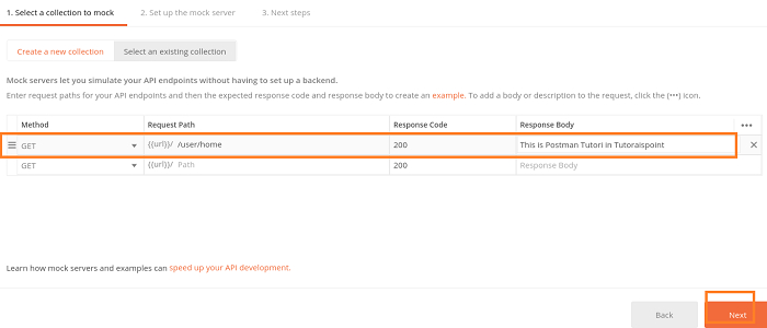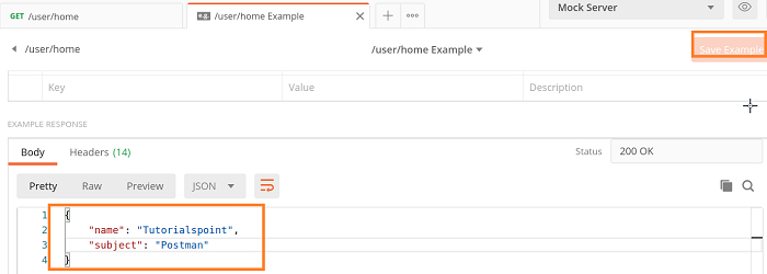 步骤 2 - 从“方法”字段中选择“GET”选项。在“请求路径”中添加 /user/home,在“响应代码”中添加 200,在“响应正文”字段中添加文本 – This is Postman Tutori in Tutorialspoint。