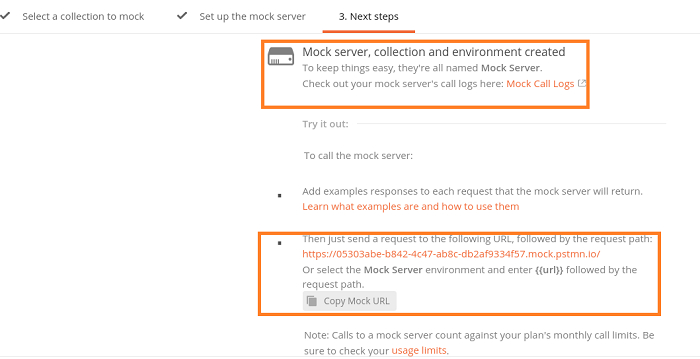 步骤 4 - 模拟服务器已创建,并带有模拟URL。要复制模拟URL,应点击“复制模拟URL”按钮。点击“关闭并继续”。