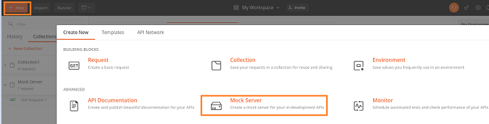 步骤 1 - 点击Postman应用程序顶部的“新建”,然后点击“模拟服务器”链接。