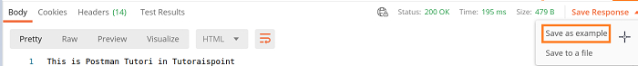 步骤 6 - 要以JSON格式获取响应,我们必须从“保存响应”下拉菜单中选择“保存为示例”选项。