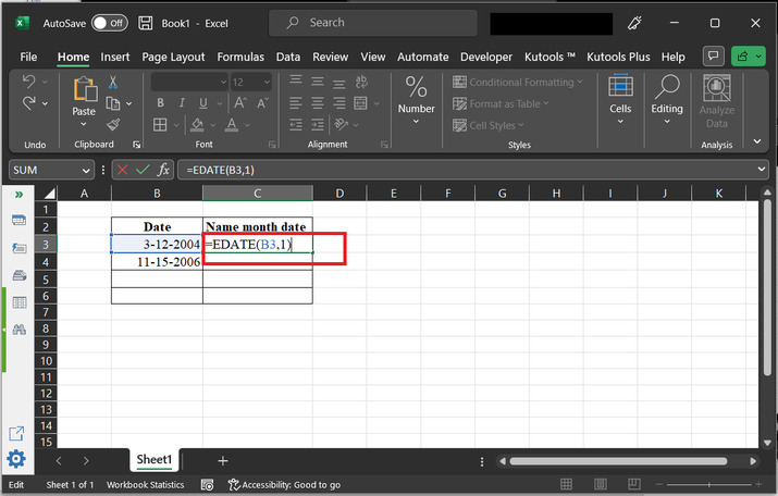 在单元格中输入“=EDATE(B3,1)” 并按“Enter” 键。
