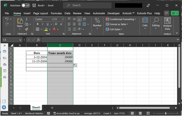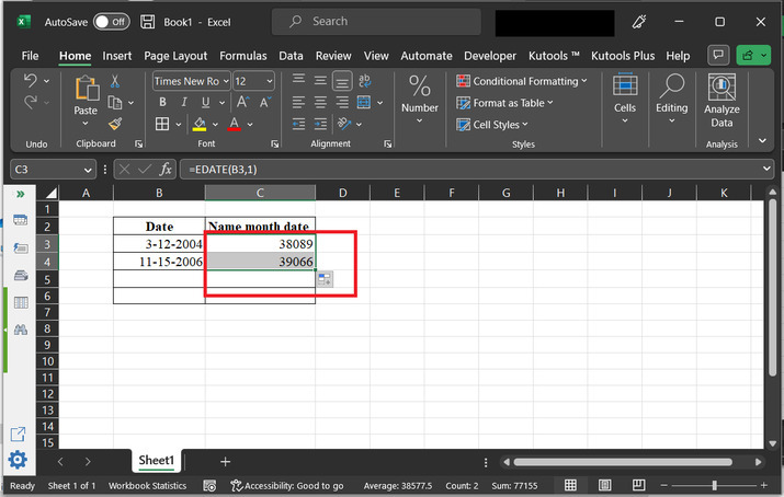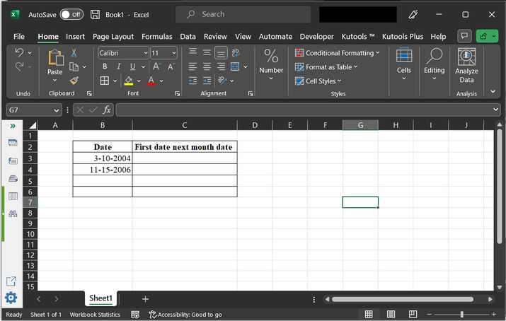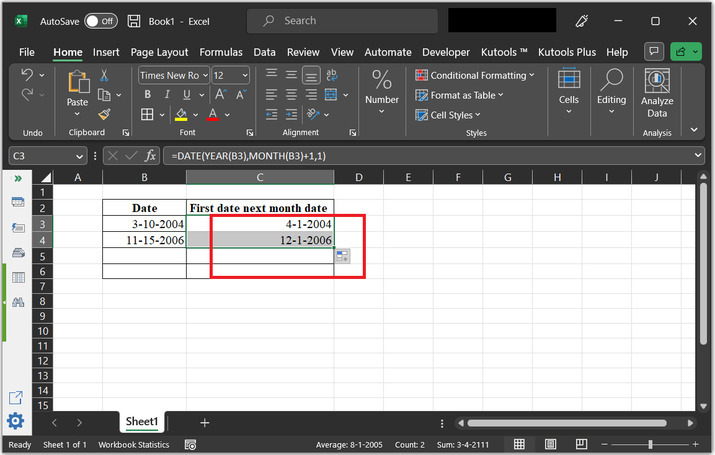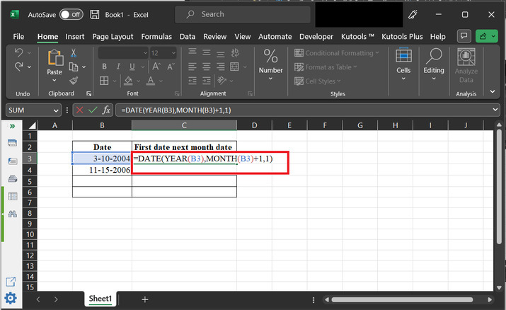 最后,在 Microsoft Excel 中使用提供的公式返回一个日期,该日期表示 B3 单元格中特定日期后的月份的第一天。