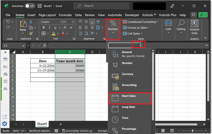 下一步包括从样式部分选择“数字”,然后单击出现的下拉箭头。最后,选择“短日期”选项。