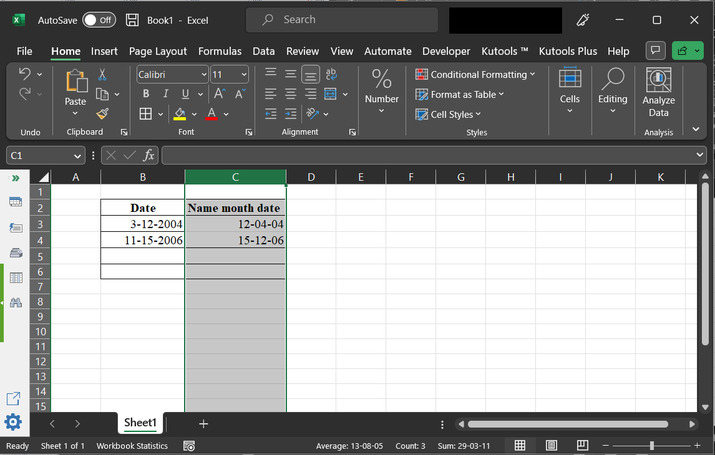 然后转到 C 列,并通过单击单元格标题“C”选择整列。这将更改单元格的外观,如下所示。