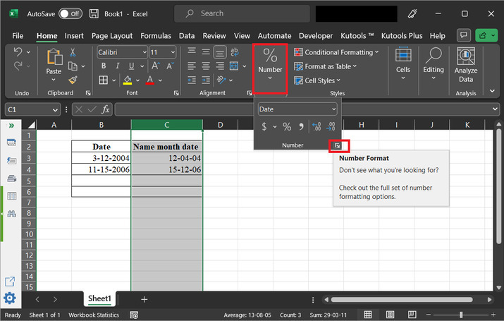 要将日期更改为 B 列设置,请再次单击“数字”选项,然后选择“右下角箭头”,如下所示。