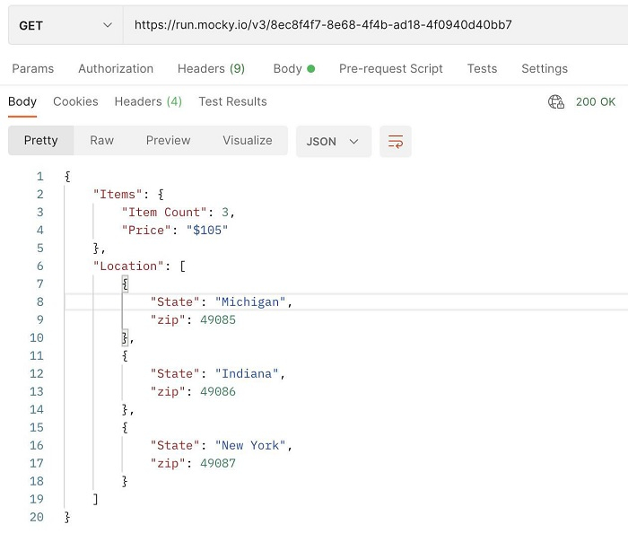 最后,要获取 JSON 数组大小,我们必须使用 size 方法。我们将在模拟 API 上通过 Postman 发送 GET 请求,并查看 Response。