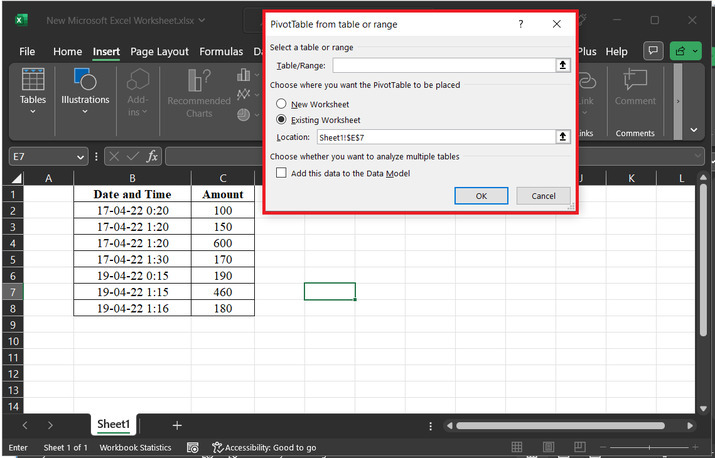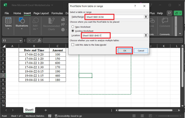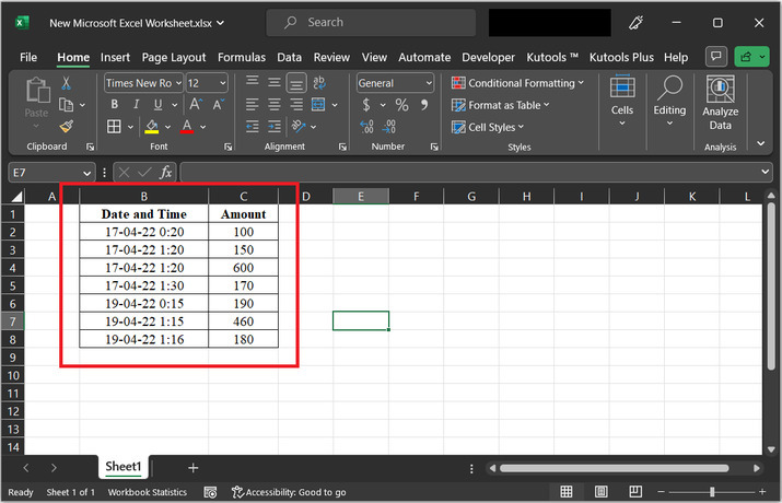 让我们首先创建一个示例工作表。在创建的表格中,输入日期和时间以及金额的数据。在日期和时间列中写入列值的数据。在第二个金额列中,添加金额列的数据。