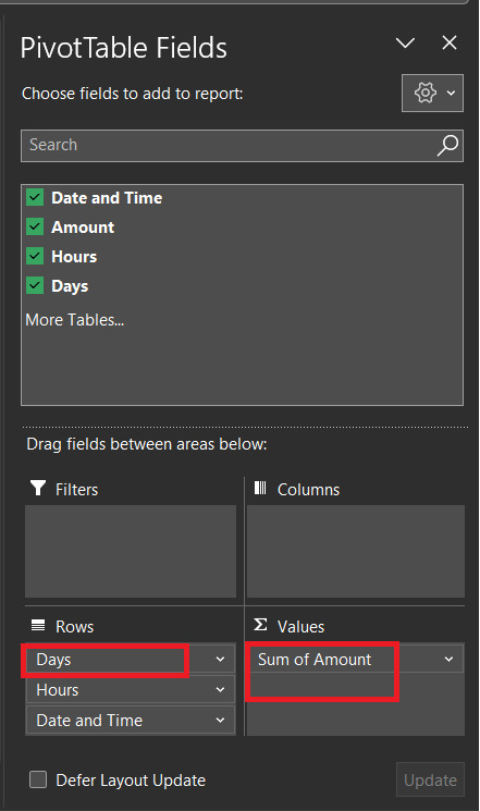 上述步骤将打开一个数据透视表字段窗格。在打开的窗格的行部分中,拖动“日期和时间”的数据,并在列部分中拖放金额值的数据。为了便于参考,请考虑下图 -