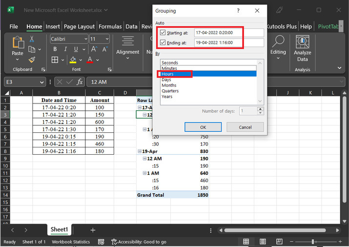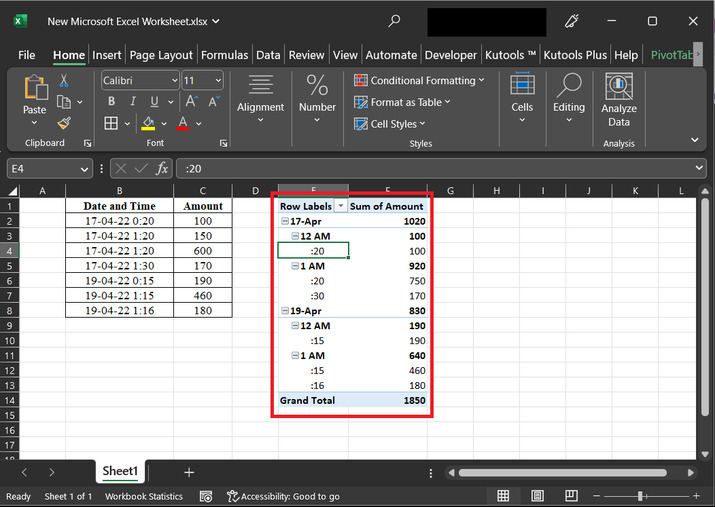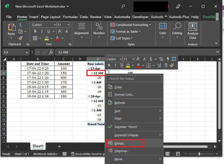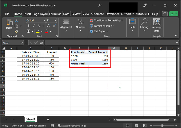 示例 1:使用数据透视表选项按小时对 Excel 数据透视表进行分组