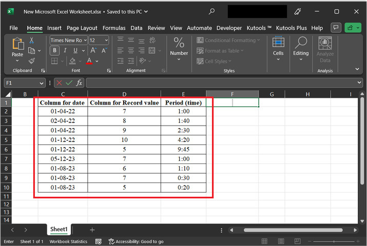 假设 Excel 表格包含三列。第一列包含日期字段,第二列包含记录字段,第三列包含时间段的数据字段。用户可以根据需要更改单元格格式和语法。