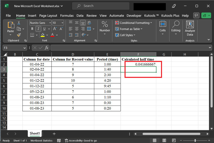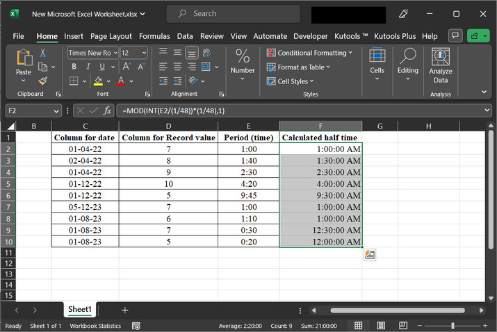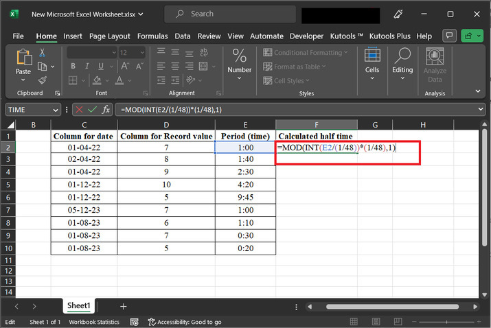 此步骤将首先创建一个辅助列。为此,首先转到 F2 单元格,然后为值创建列标题。只需将“计算的半年时间”写入 F1 单元格即可。之后转到 F2 单元格,并键入公式“=MOD(INT(E2/(1/48))*(1/48),1)”。 正确的操作方法如下所示 -